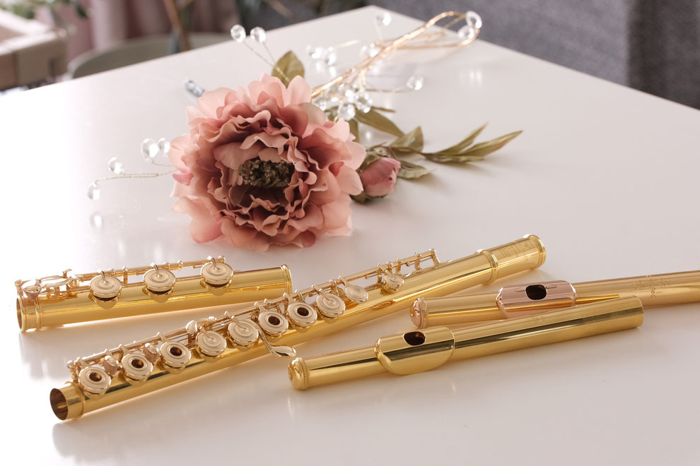 2024年よりファミリーに加わった三響フルート製のゴールドフルート。